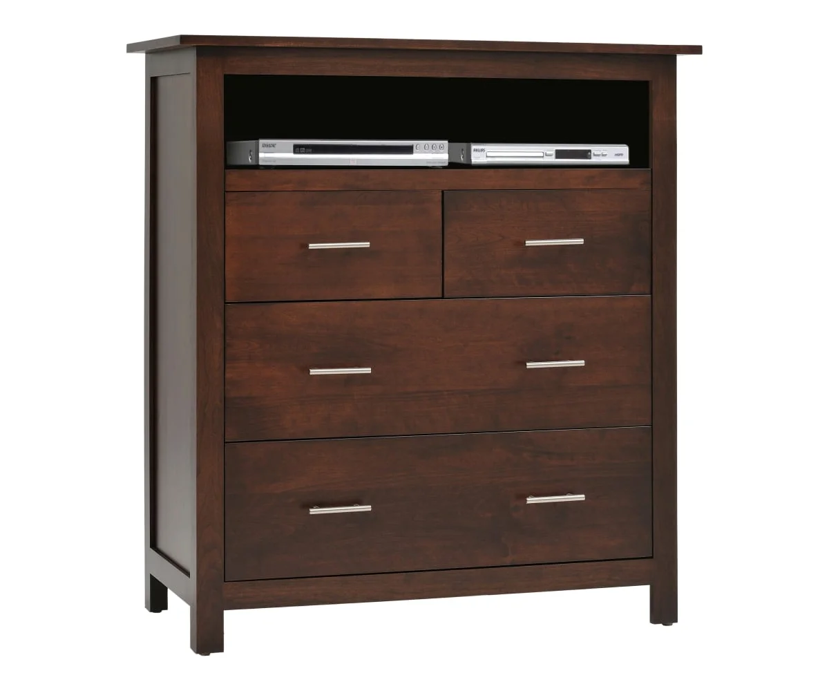 The Ashton Transitional 4-Drawer Chest with Open Display Shelf, made by Millcraft,