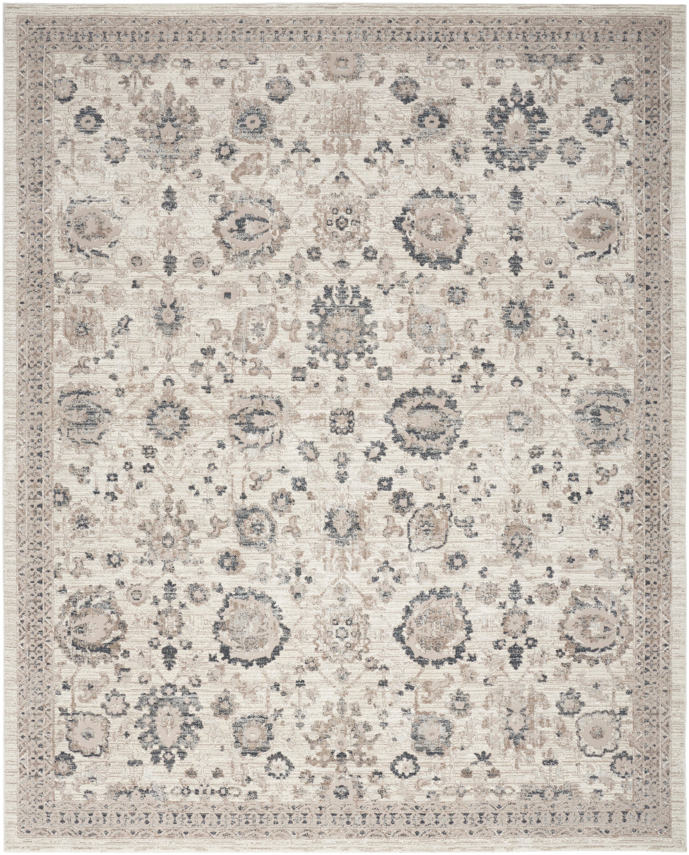 Finished with an eye-catching, lustrous sheen, OEKO-TEX Certified, Sustainably made with 100% recycled polyester, Persian-inspired rug with a soft, neutral palette that easily complements a variety of styles, 100% recycled polyester, Low-profile, easy-clean construction ideal for busy households with pets and young kids, Recommended for areas with moderate foot traffic, Due to the detailed construction of our rugs, both handmade and machine-made, sizes may vary by up to three inches in width or length., We recommend a rug pad to help keep your rug in place and extend its life