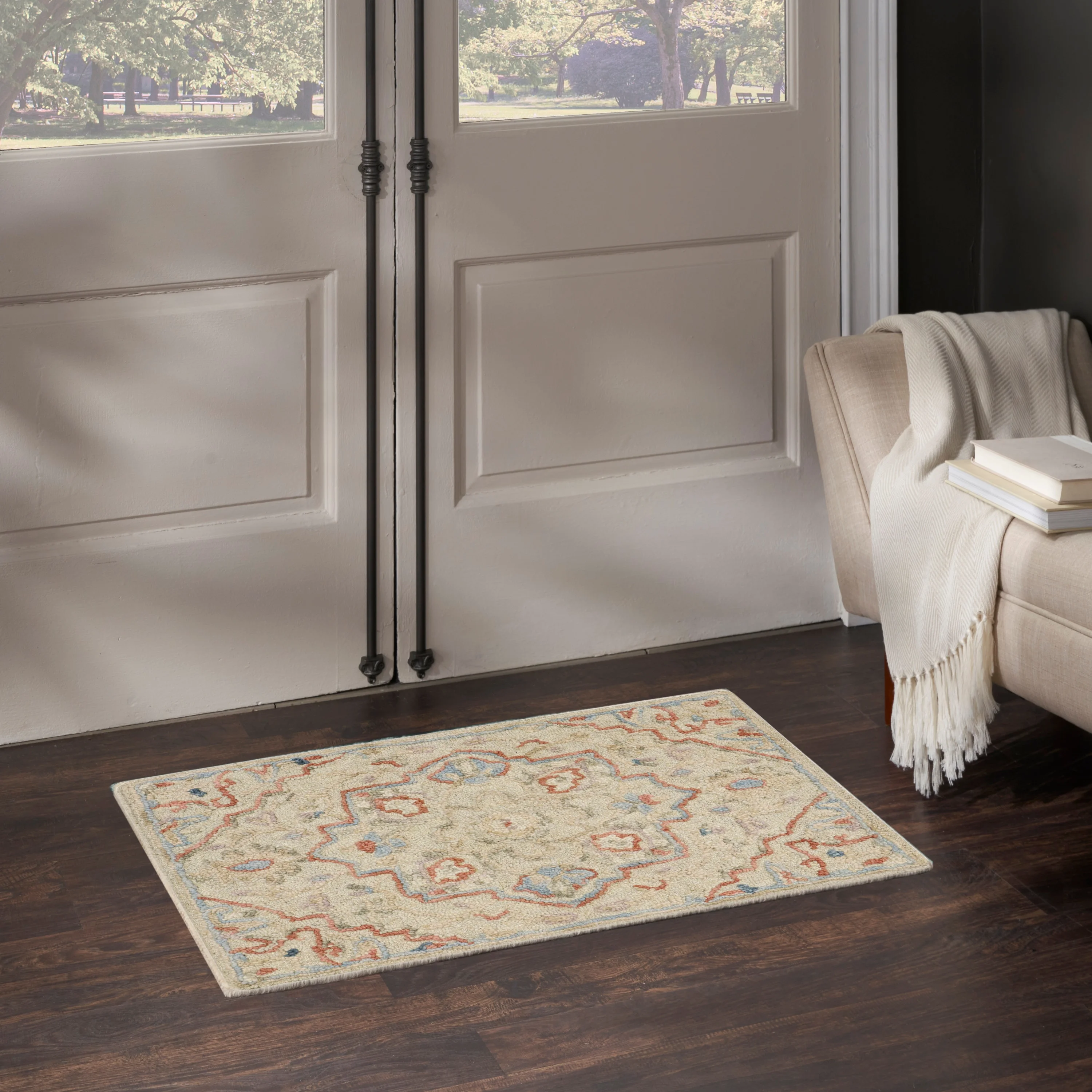 - Persian-style rug with a traditional floral pattern in soft colors for easy decorating