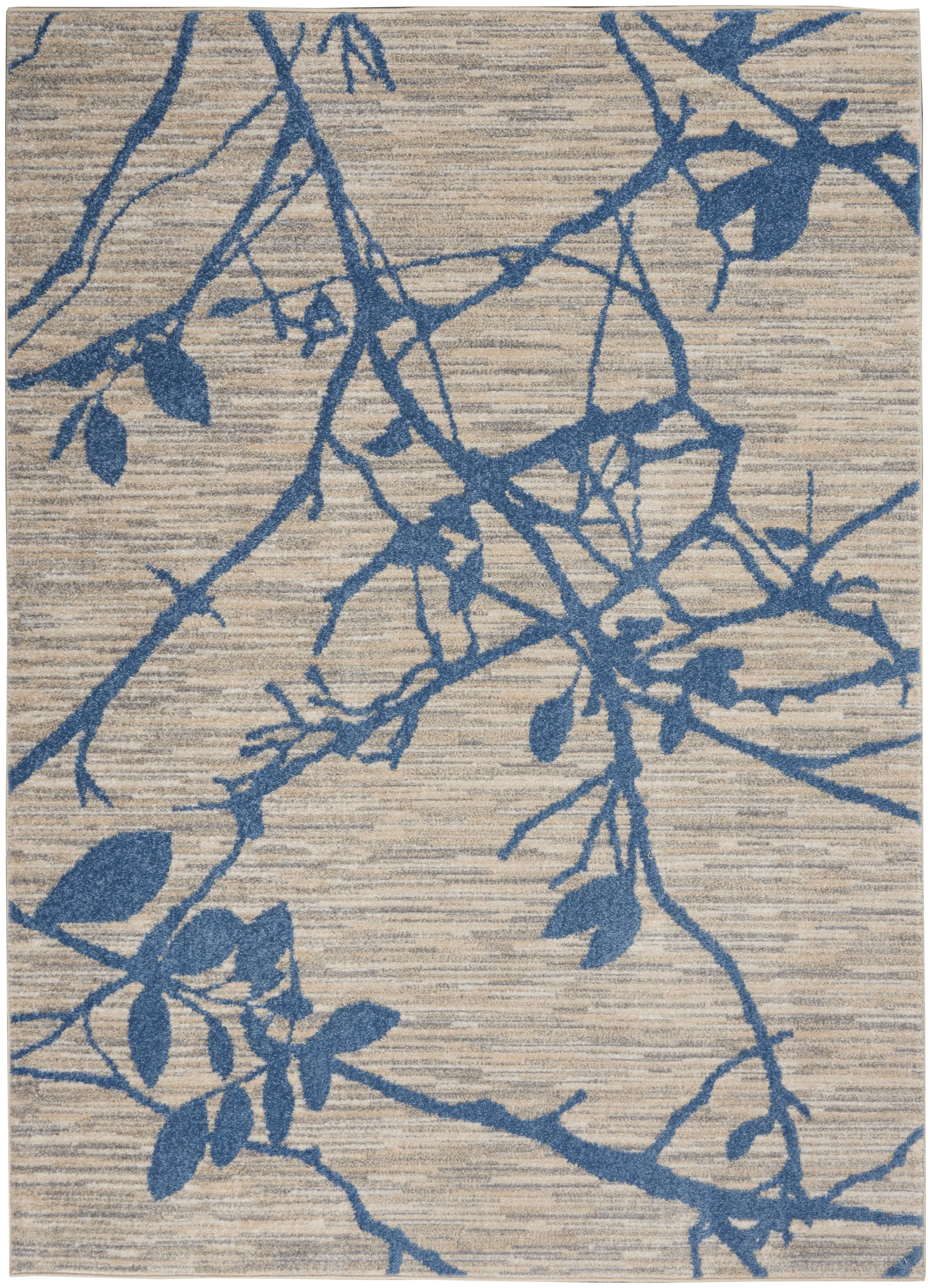 Recommended for areas with moderate foot traffic, Easy care, Modern botanical design, Minimalist, versatile palette of rich blue on beige, Due to the detailed construction of our rugs, both handmade and machine-made, sizes may vary by up to three inches in width or length., Rug pad recommended