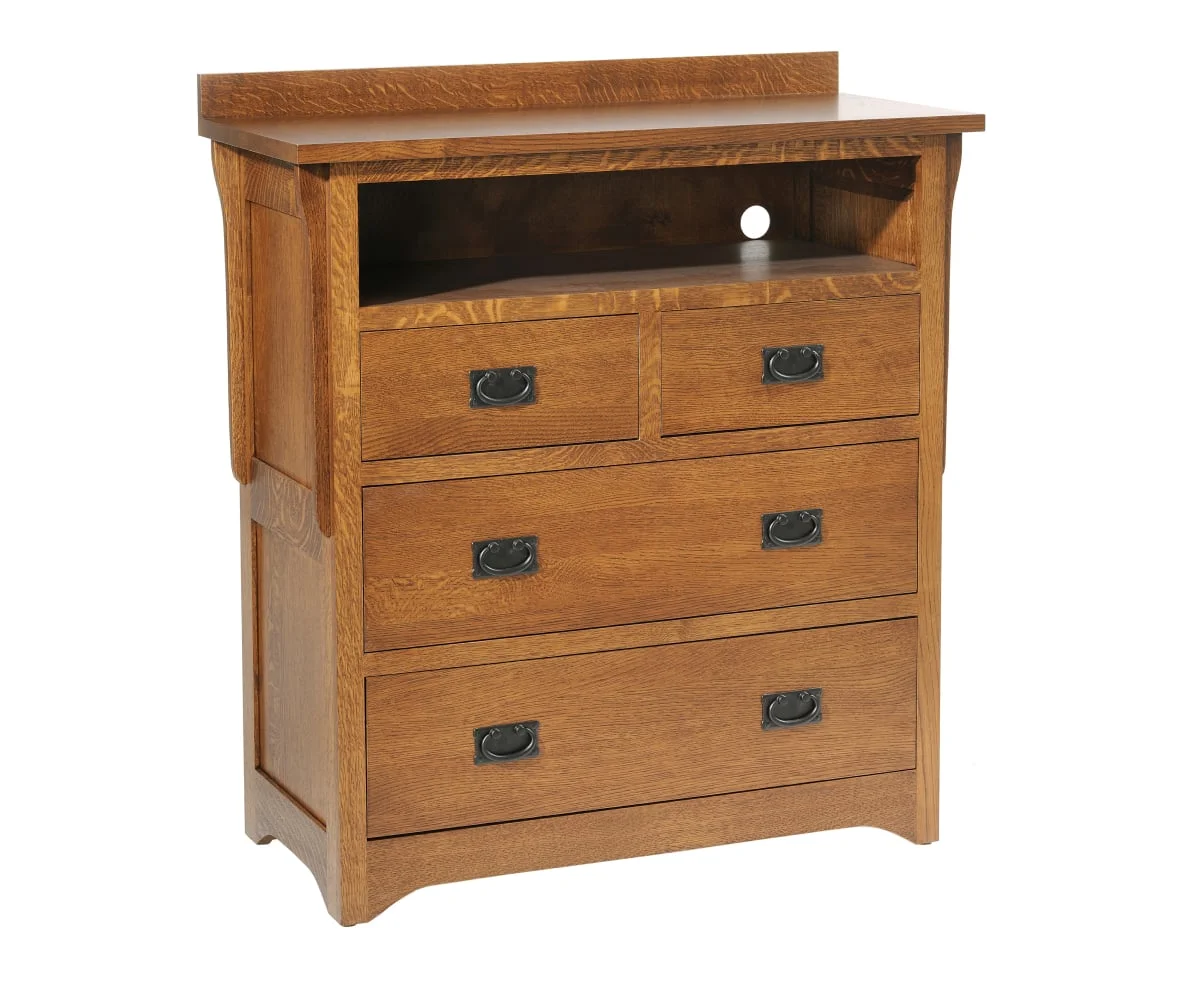 The San Juan Mission Transitional 40" Chest of Drawers with Open Shelf, made by Millcraft,